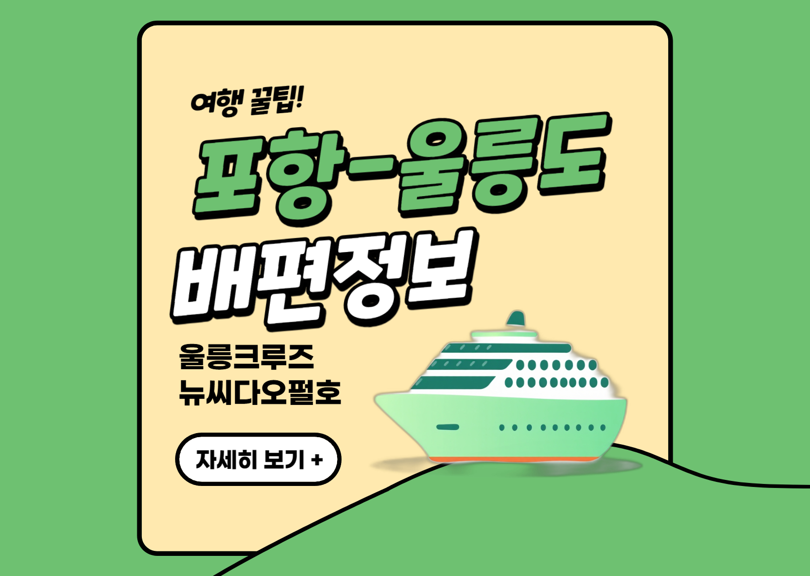포항에서 배를 타고 울릉도도 여행 갈 계획이신가요? 울릉도는 육지와 연결된 다리가 없어서 배를 타야 갈 수 있죠. 바다 날씨에 따라서 영향을 크기 받기 때문에 배편 시간과 날씨도 꼭 확인해야 해요. 포항에서 울릉도 가는 배편은 두 가지가 있는데, 빠르게 가는 방법과 크루즈로 느긋하게 가는 방법이 있습니다. 오늘 포스팅에서는 느긋하게 가는 배편인 울릉크루즈의 뉴씨다오펄호의 시간표와 가격 예약링크를 안내해 드리겠습니다. 포항에서 울릉도로 배 타고 여행하실 분들은 위 빨간 버튼을 클릭해서 확인해 보세요.